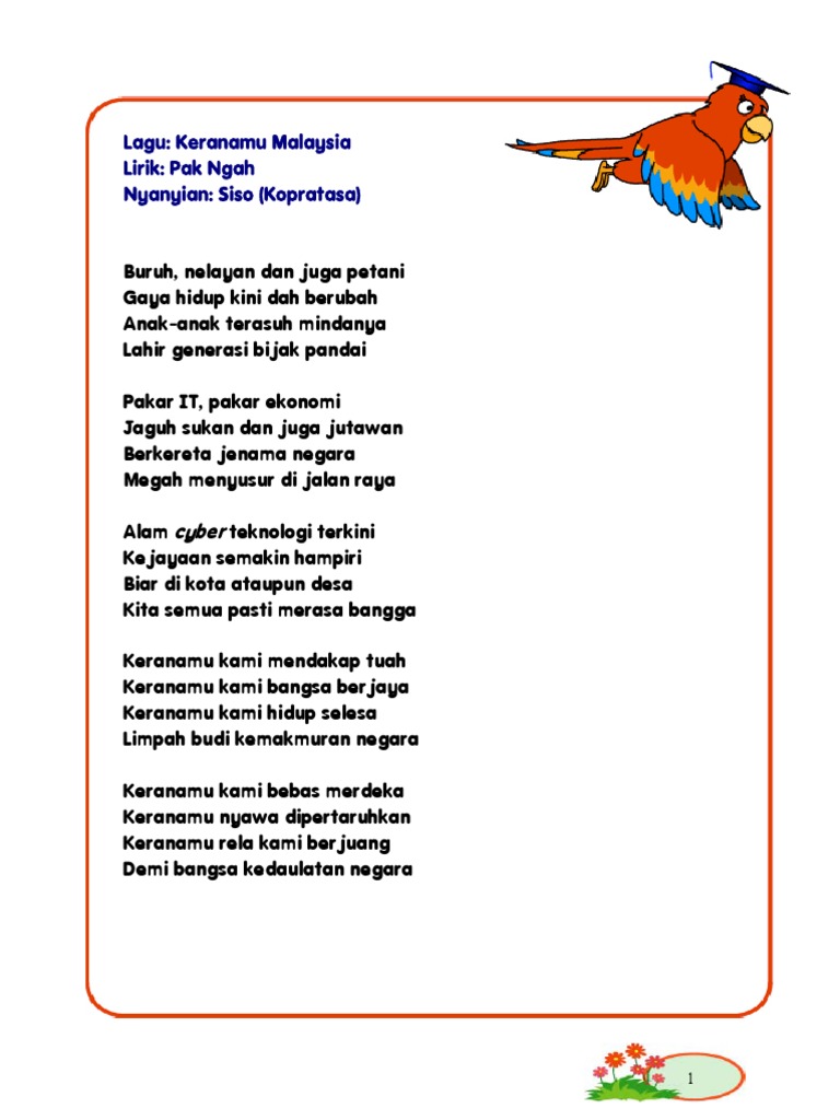 Putihmu bersih budi pekerti Kuning berdaulat payung negara Biru perpaduan kami semua Puncak dunia telah kau tawan Lautan luas telah kau redah. Keranamu Malaysia Pak Ngah Siso Kopratasa Keranamu Malaysia Buruh nelayan dan juga petani Gaya hidup kini dah berubah Anak-anak terasuh mindanya Lahir generasi bijak pandai Pakar IT pakar ekonomi Jaguh sukan dan juga jutawan Berkereta jenama negara Megah menyusur di jalan raya. Lirik Lagu Lirik Lagu Keranamu Malaysia.